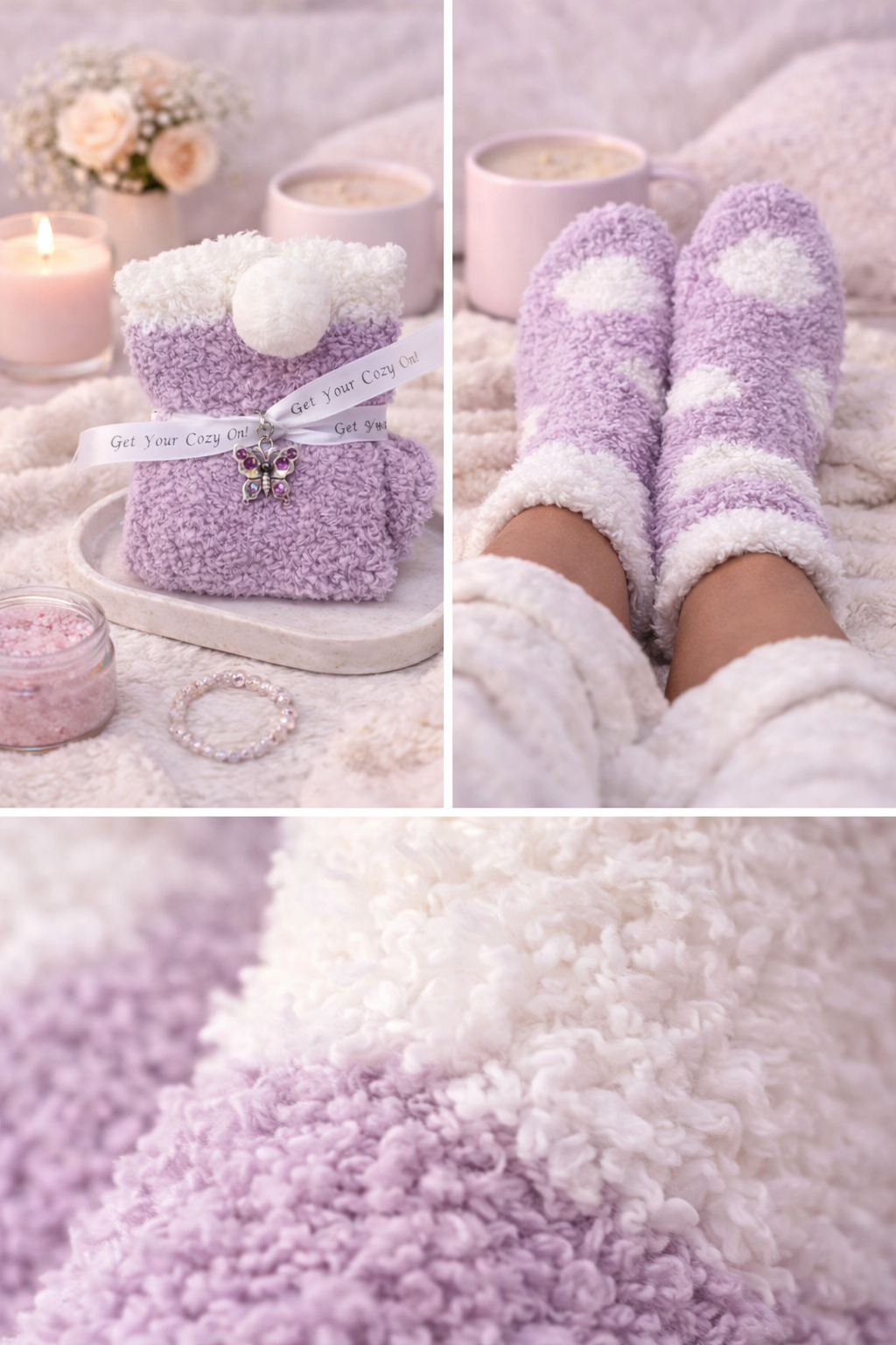 Made with a luxuriously fluffy texture, these cozy lavender socks feel like a warm hug for your feet. The soft lavender and cream design paired with the butterfly charm symbolizes transformation, beauty, and self-love—core values of The Curated Woman brand.